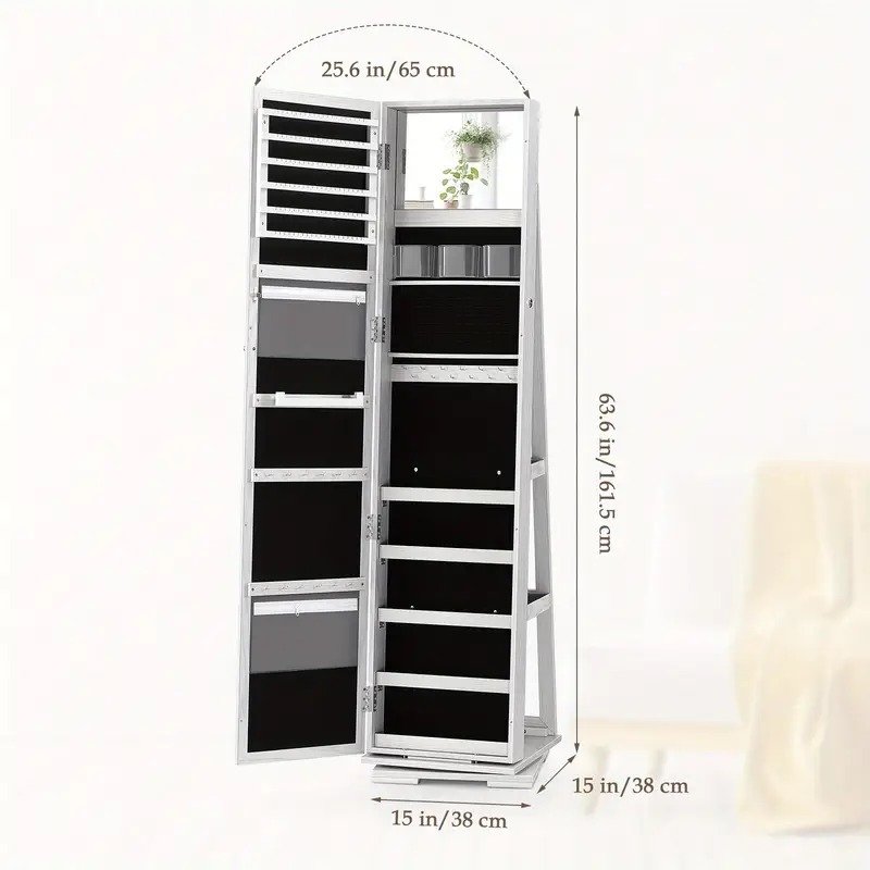 Questo elegante armadio ti permette di provare diversi abbinamenti di gioielli grazie allo specchio a figura intera in vetro premium, che offre una visione completa del tuo outit.